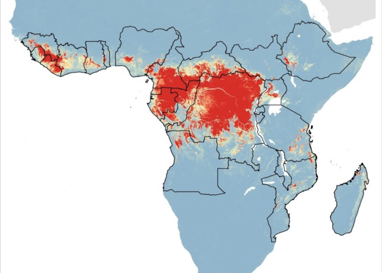 O novo mapa, publicado nesta segunda-feira, mostra que grandes partes da África Central, assim como regiões da África Ocidental, têm características que os cientistas chamam de “nichos zoonóticos” para o ébola.